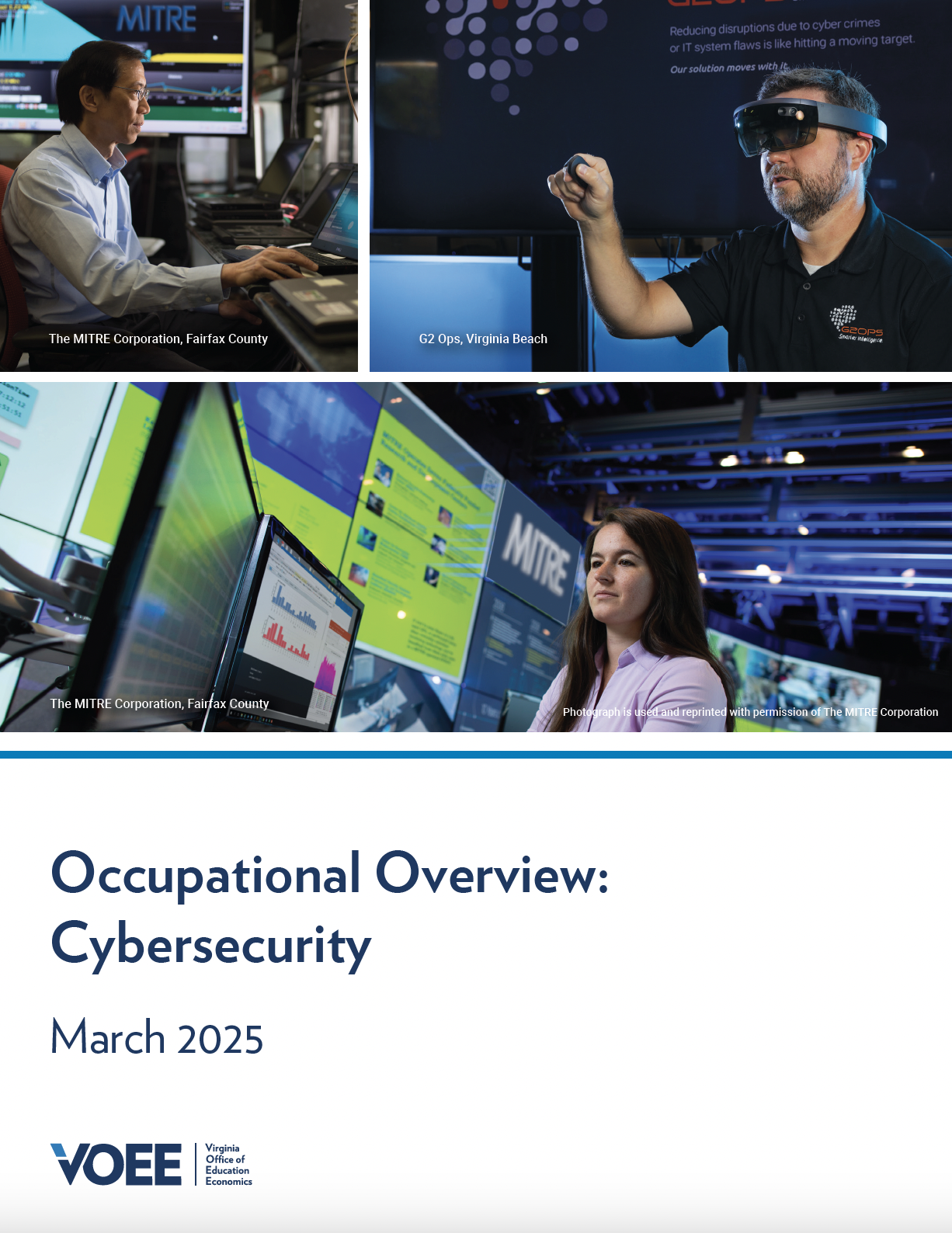 The following sections explore the educational backgrounds, industries of employment, regional distribution, and career progression of cybersecurity analysts. Statewide employment data were sourced from the BLS and accessed through workforce analytics firm Lightcast. Data on educational background and occupational transitions are derived from the Virginia Office of Education Economics’ (VOEE) College and Career Outcomes Dataset. This longitudinal dataset matches the records of alumni of Virginia higher education institutions with their professional social profiles. It includes over 7,500 Virginia graduates who worked as cybersecurity analysts between 2008 and 2022.